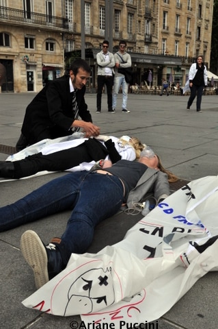 Quelques passants s’arrêtent et regardent cette scène, inquiets, curieux ou amusés. Quelques minutes plus tard, l’infirmière s’effondre au côté de la piétonne. Les deux mortes sur la chaussée sont disposées dans des housses mortuaires ciglées d’un petit pigeon renfrogné, et d’un slogan : « La rentabilité tue ».