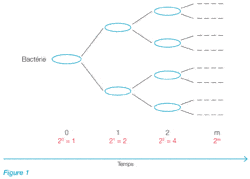 Théoriquement, une bactérie, placée dans un milieu convenable, peut se multiplier indéfiniment, par fission binaire. La croissance se fait selon une progression géométrique : 1, 2, 4, 8, etc. ou 20, 21, 22, 23,… 2n (où n = nombre de générations). Il s’agit d’une croissance exponentielle.