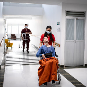 Dans la chambre de Mme V., hospitalisée à la suite d’un AVC, Angélica Simancas, orthophoniste, parcourt doucement le visage de la patiente à l’aide d’un vibromasseur. « J’applique des vibrations sur les muscles du bas du visage pour encourager la sensibilité et la mobilité. C’est une technique qu’on utilise pour les patients qui souffrent de paralysie faciale. » À quelques mètres de là, dans le gymnase de l’IPS San Luis, Daisy Niño et Fabian Cañas, tous deux kinésithérapeutes, font travailler ce matin trois patients : un jeune, victime d’un accident de moto, s’exerce à fléchir son genou, tandis que deux autres, plus âgés, entraînent la motricité de leurs bras en plaçant et retirant des balles d’un sac. Outre les soins quotidiens administrés par les infirmières en chef et les auxiliaires d’infirmerie, chaque patient de l’IPS San Luis est intégré à un programme de réhabilitation, porté par un groupe de huit personnes. « Lorsque les patients que l’on accueille sont dans ce qu’on appelle la « fenêtre neurologique » – c’est-à-dire la période à la suite de leur traumatisme au cours de laquelle subsistent des chances de recouvrer des aptitudes – l’équipe de réhabilitation essaie, à travers la kinésithérapie, l’ergothérapie, l’orthophonie, l’accompagnement psychologique, à les faire progresser de façon intensive », explique Natalia Acevedo. Quand il est « trop tard », « ils suivent néanmoins des séances de réhabilitation pour maintenir leurs capacités et freiner la détérioration de leur état ». Comme pour M. F., qui est hospitalisé ici depuis 2018 : âgé d’une trentaine d’années, en fauteuil roulant, il subit encore les conséquences du trauma crânien provoqué par une balle reçue dans la tête alors qu’il était enfant. « Le jour où mon père a été abattu sous mes yeux », explique-t-il. Pour chaque personne, un programme est mis au point entre les différents soignants, « en fonction de différents facteurs tels que l’âge, l’histoire clinique, les recommandations des médecins qu’ils ont vus ». Un accompagnement psychologique est également mené par Lorena Hernandez auprès des patients et de leurs familles, lorsqu’ils en ont. « Nous avons aussi quelques personnes abandonnées. »