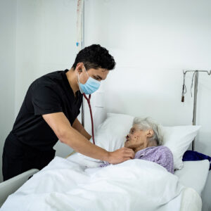 La clinique s’étend sur deux étages, dont le deuxième est dédié aux situations les plus difficiles. Aujourd’hui, 80% des patients accueillis sont des malades chroniques complexes, qui relèvent de deux ordres : « Ils souffrent de séquelles liées soit à une complication d’une pathologie chronique – diabète, maladie rénale, bronchopneumopathie chronique obstructive, hypertension artérielle – soit à un événement – une blessure par arme à feu, un accident… », explique Natalia Acevedo, infirmière. Pour la plupart, ces personnes toutes hospitalisées sont « alitées, en dépendance fonctionnelle totale, avec des affections neurologiques et physiques souvent irréversibles. La plupart ne s’expriment pas verbalement ». Stabilisées, elles ne requièrent pas la plupart du temps d’une prise en charge médicale urgente – même si la clinique est dotée de soins intensifs en cas de besoin. « La majorité des soins consiste en l’assistance à la vie quotidienne, ce qui permet un rythme de travail assez tranquille », poursuit l’infirmière. « Depuis ses débuts, insiste Luis Carlos Ordoñez, le modèle d’attention de l’IPS San Luis repose sur les infirmiers, c’est vraiment une spécificité du lieu. » L’unité compte cinq infirmiers en chef – qui ont suivi des études en 4 ou 5 ans et sont reconnaissables, pour les femmes, au liseré doré sur leur coiffe – et 30 à 40 « auxiliaires d’infirmerie » dont la formation dure un an et demi à deux ans et dont le rôle se rapproche de celui des aides-soignants en France. Ces derniers réalisent la plupart des soins – la toilette, les changements de position, le confort, la mobilité, les soins dermatologiques, le contrôle des signes vitaux, l’alimentation (par sonde de gastrostomie pour la plupart). Les infirmiers en chef, de leur côté, gèrent l’administration de certains médicaments, les drains, les cathéters, les plans de soins du patient, la vérification des ordonnances et l’évolution des symptômes. Mais leur fonction va plus loin : dans cet environnement très hiérarchisé qui caractérise le système de santé colombien, ils supervisent aussi le travail des auxiliaires. Deux d’entre eux, Natalia Acevedo et Marlon Montes, ont par ailleurs un rôle de coordination qui recouvre des aspects médicaux et administratifs : ils orchestrent le parcours de soin entre le patient, la famille et les autres soignants, depuis son arrivée et tout au long de son suivi. « Ils sont en charge des auxiliaires d’infirmerie, des différents soignants intervenants mais également des médecins ». Si les soins chroniques et palliatifs restent peu abordés dans les études en soins infirmiers classiques, « des formations complémentaires sont désormais accessibles” », explique Natalia Acevedo qui travaille ici depuis 10 ans. Elle apprécie cette relation de long terme avec les patients. « Le plus ancien est là depuis 12 ans… Cela nous laisse le temps de les connaître de façon approfondie. »