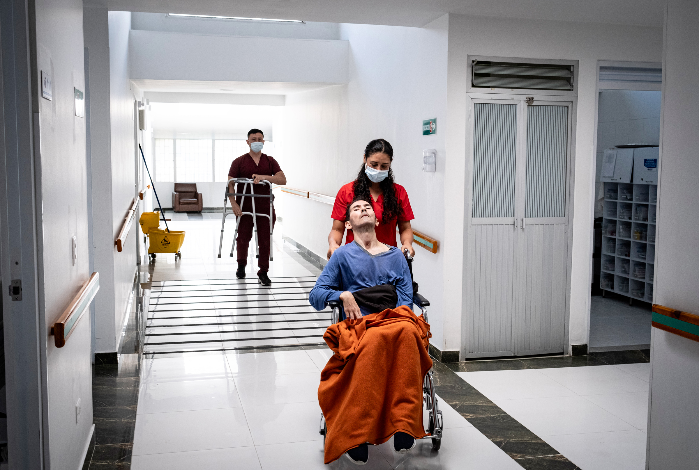 Dans la chambre de Mme V., hospitalisée à la suite d’un AVC, Angélica Simancas, orthophoniste, parcourt doucement le visage de la patiente à l’aide d’un vibromasseur. « J’applique des vibrations sur les muscles du bas du visage pour encourager la sensibilité et la mobilité. C’est une technique qu’on utilise pour les patients qui souffrent de paralysie faciale. » À quelques mètres de là, dans le gymnase de l’IPS San Luis, Daisy Niño et Fabian Cañas, tous deux kinésithérapeutes, font travailler ce matin trois patients : un jeune, victime d’un accident de moto, s’exerce à fléchir son genou, tandis que deux autres, plus âgés, entraînent la motricité de leurs bras en plaçant et retirant des balles d’un sac. Outre les soins quotidiens administrés par les infirmières en chef et les auxiliaires d’infirmerie, chaque patient de l’IPS San Luis est intégré à un programme de réhabilitation, porté par un groupe de huit personnes. « Lorsque les patients que l’on accueille sont dans ce qu’on appelle la « fenêtre neurologique » – c’est-à-dire la période à la suite de leur traumatisme au cours de laquelle subsistent des chances de recouvrer des aptitudes – l’équipe de réhabilitation essaie, à travers la kinésithérapie, l’ergothérapie, l’orthophonie, l’accompagnement psychologique, à les faire progresser de façon intensive », explique Natalia Acevedo. Quand il est « trop tard », « ils suivent néanmoins des séances de réhabilitation pour maintenir leurs capacités et freiner la détérioration de leur état ». Comme pour M. F., qui est hospitalisé ici depuis 2018 : âgé d’une trentaine d’années, en fauteuil roulant, il subit encore les conséquences du trauma crânien provoqué par une balle reçue dans la tête alors qu’il était enfant. « Le jour où mon père a été abattu sous mes yeux », explique-t-il. Pour chaque personne, un programme est mis au point entre les différents soignants, « en fonction de différents facteurs tels que l’âge, l’histoire clinique, les recommandations des médecins qu’ils ont vus ». Un accompagnement psychologique est également mené par Lorena Hernandez auprès des patients et de leurs familles, lorsqu’ils en ont. « Nous avons aussi quelques personnes abandonnées. »