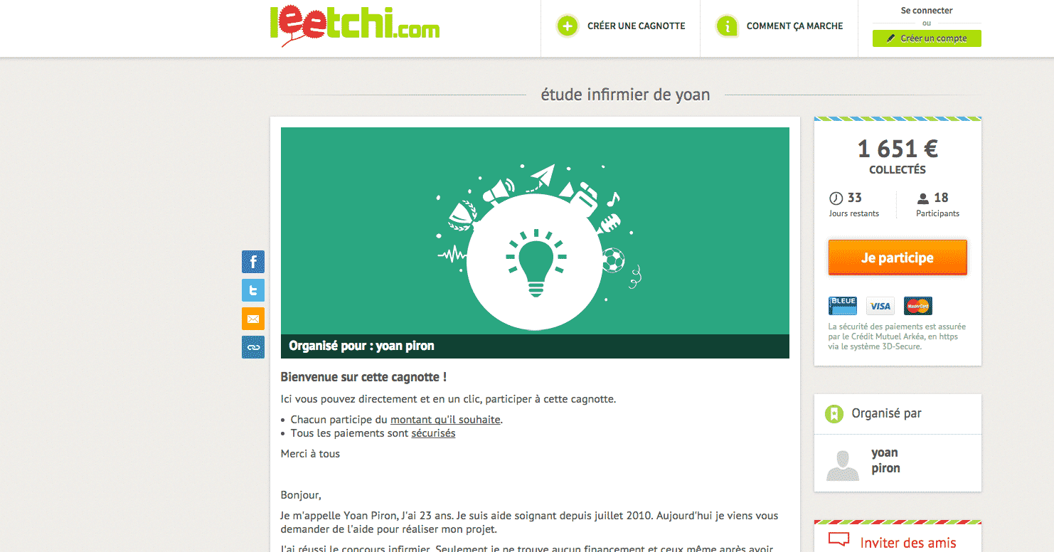 “Je m’appelle Yoan Piron, J’ai 23 ans. Je suis aide-soignant depuis juillet 2010. Aujourd’hui je viens vous demander de l’aide pour réaliser mon projet”, écrit-il sur la page du site internet leetchi.com.