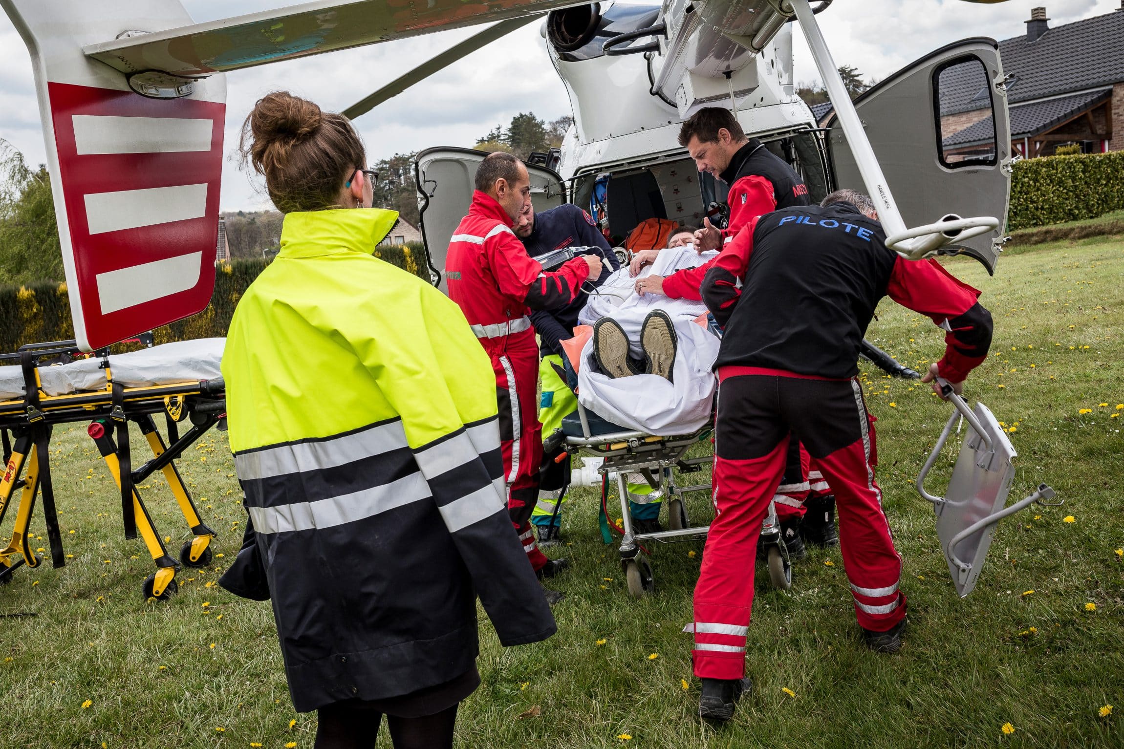 - Stoumont, 26 Avril 2017. Le patient se plaint de douleurs thoraciques. Les ambulanciers locaux ainsi que les trois membres de l’équipe du CMH préparent son transfert vers l’hôpital du CHU du Sart-Tilman près de Liège, l’hôpital où l’équipe se pose le plus régulièrement. Sous le regard de la fille du patient, l’équipe s’active. Chaque mission du CMH permet à un pilote, un infirmier et un médecin de se déplacer au plus vite et au plus près du patient. Le pilote se pose la plupart du temps à moins de cent mètres du domicile.