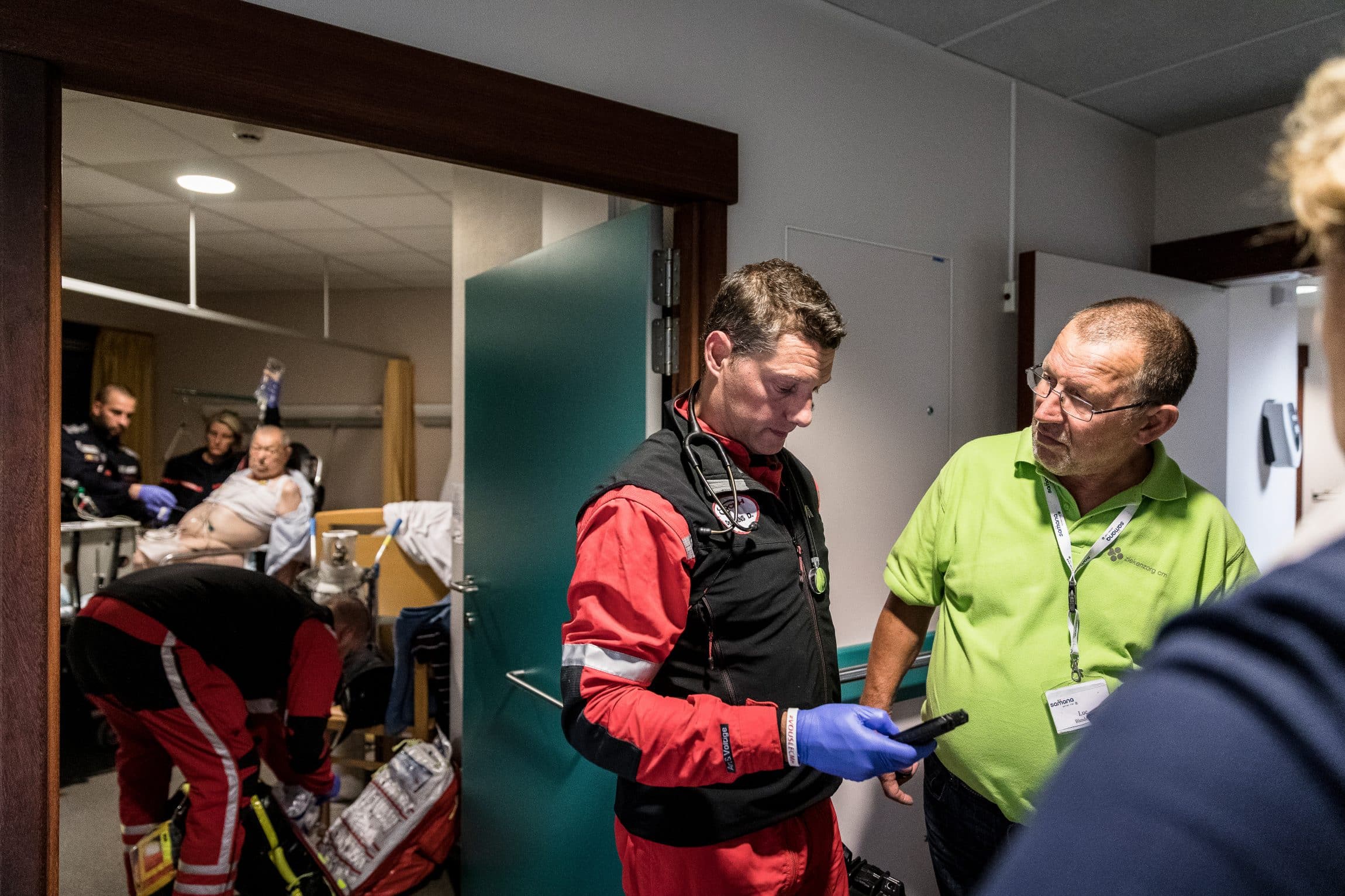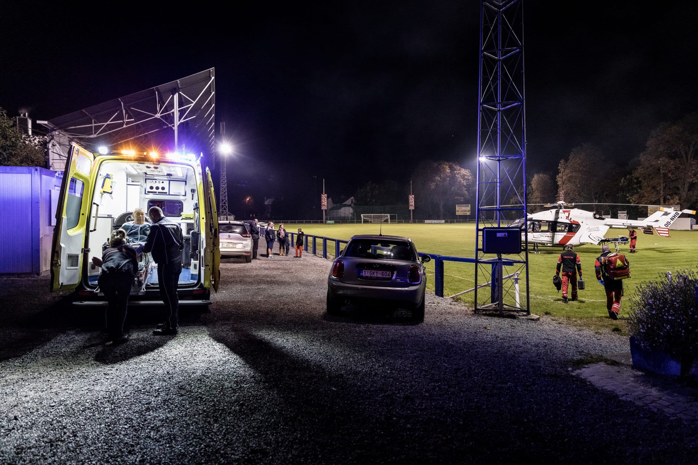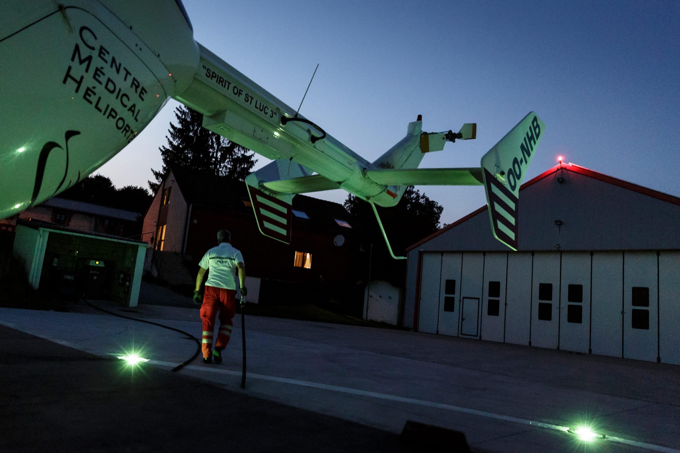 - Spa, 20 Septembre 2017. Le patient présente de grosses difficultés respiratoires. Didier Moens, médecin chef du CMH présente le bilan médical au responsable du centre de revalidation où le patient séjournait ainsi qu’aux membres de la famille présents sur place. Puis, le patient est transporté en ambulance locale jusqu’au terrain de football ou l’hélicoptère s’est posé. Grâce à une idée de l’équipe du CMH, il leur est possible de déclencher l’éclairage sur certains terrains via leur téléphone mobile pour bénéficier d’une zone d’atterrissage sécurisée lors d’interventions nocturnes. Tous les terrains ne sont pas encore équipés de ce dispositif. © Texte et photos Valentin Bianchi / Hans Lucas