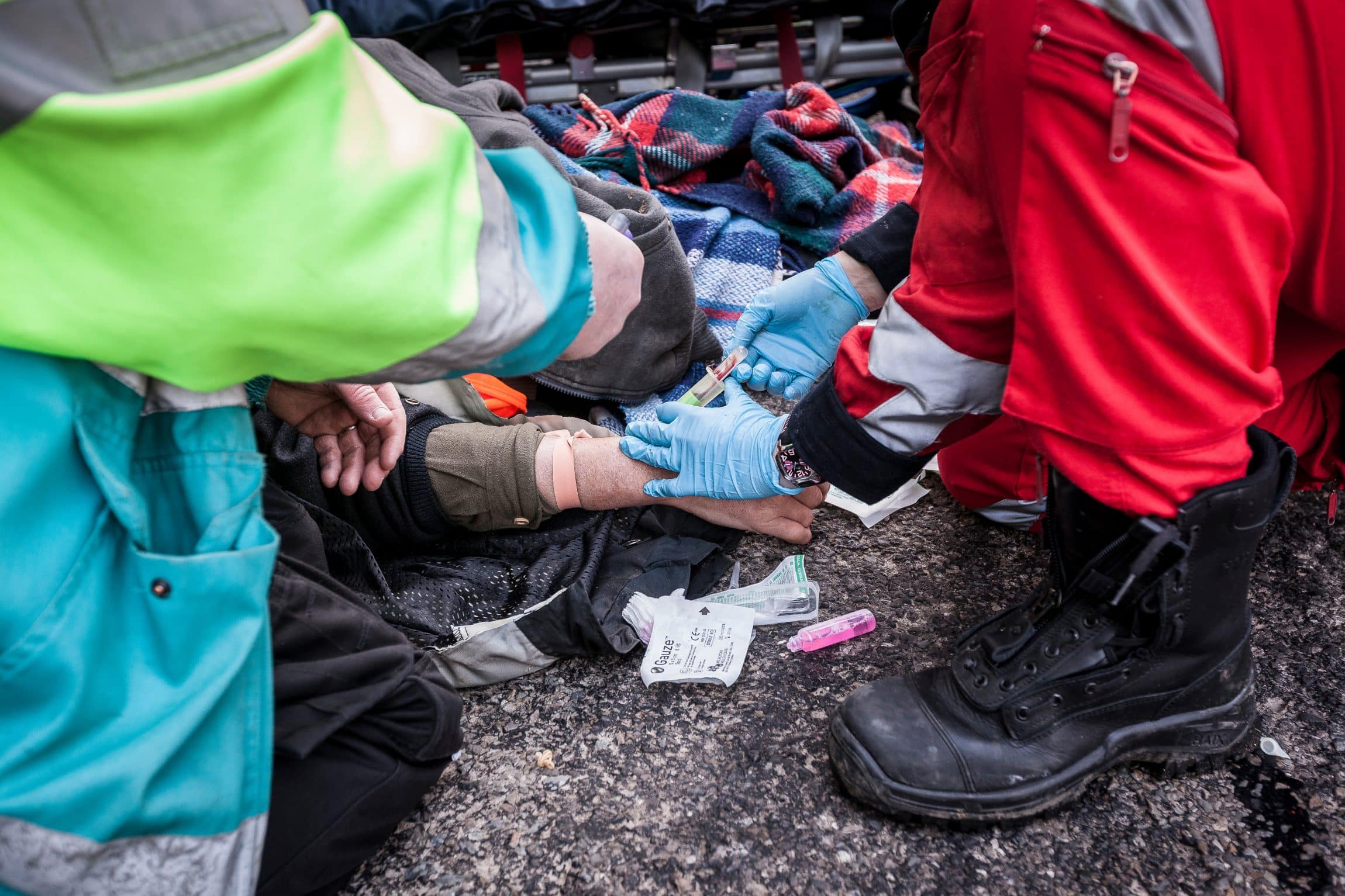 - Barvaux-sur-Ourthe, 29 Août 2013. Un patient, dans un état d’ébriété très avancé, a fait une chute dans un escalier. Son bras droit présente plusieurs fractures très lourdes. L’équipe tente de le manipuler. © Texte et photos Valentin Bianchi / Hans Lucas