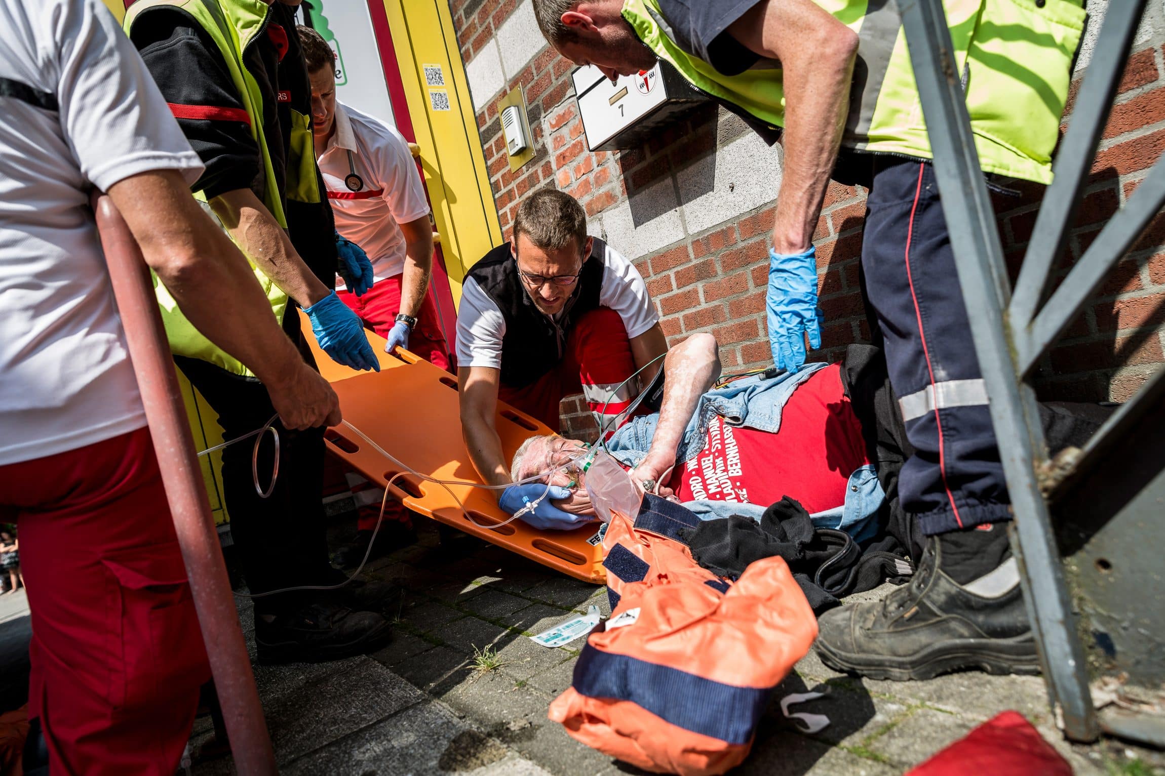 - Malmédy, 8 Juillet 2018. La patiente présente un risque de malaise cardiaque très élevé et son état empire de minutes en minutes. Avant le décollage, le médecin Sander De Wilde et l’infirmier Olivier Pirotte doivent stabiliser son état. © Texte et photos Valentin Bianchi / Hans Lucas