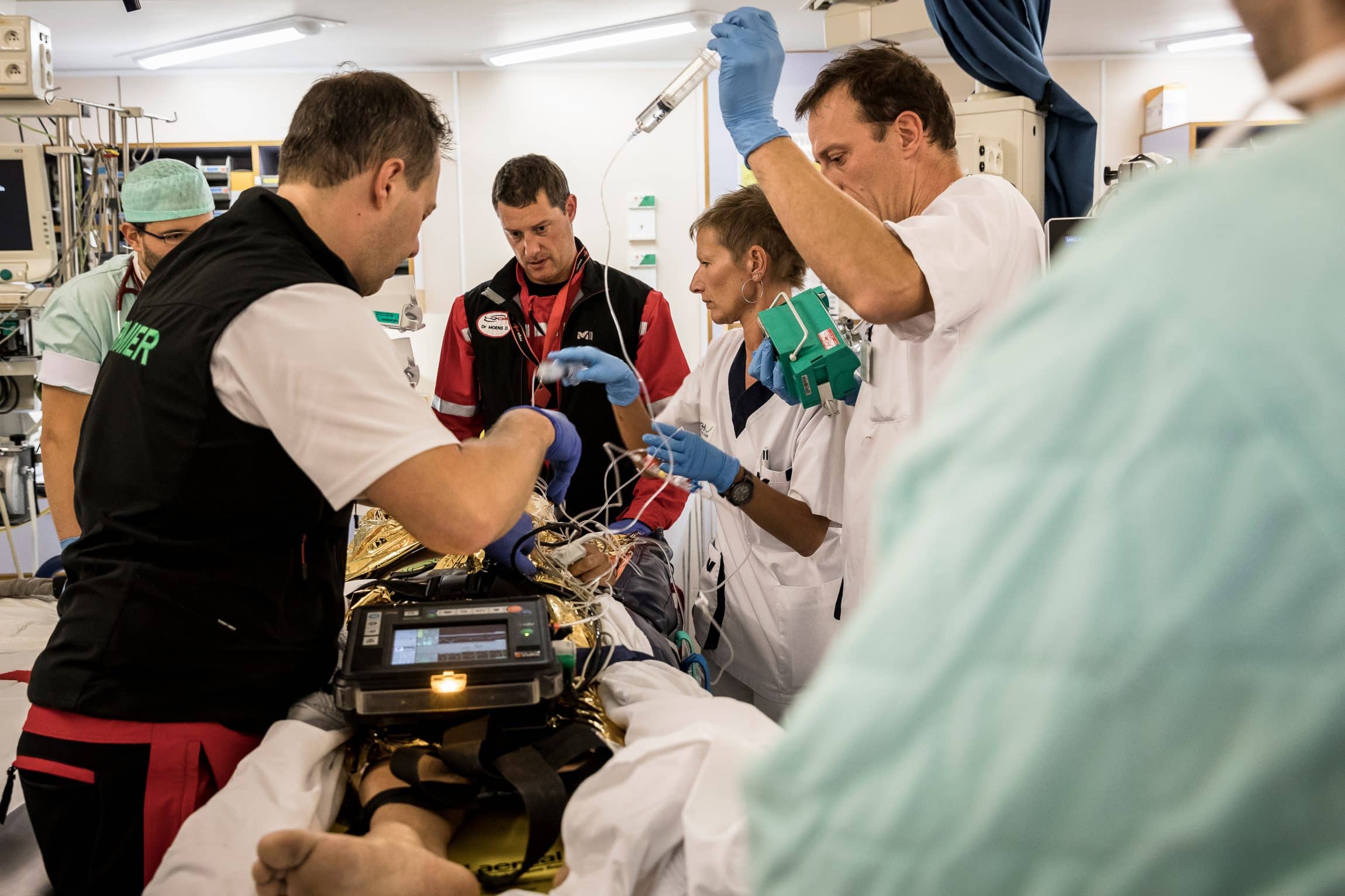 - Sart-Tilman, 21 Septembre 2017. Au CHU de Sart-Tilman près de Liège, les patients sont pris en charge par l’équipe des urgences moins de trois minutes après l’atterrissage de l’hélicoptère. Médecins et infirmiers transfèrent les informations pour une prise en charge rapide. © Texte et photos Valentin Bianchi / Hans Lucas