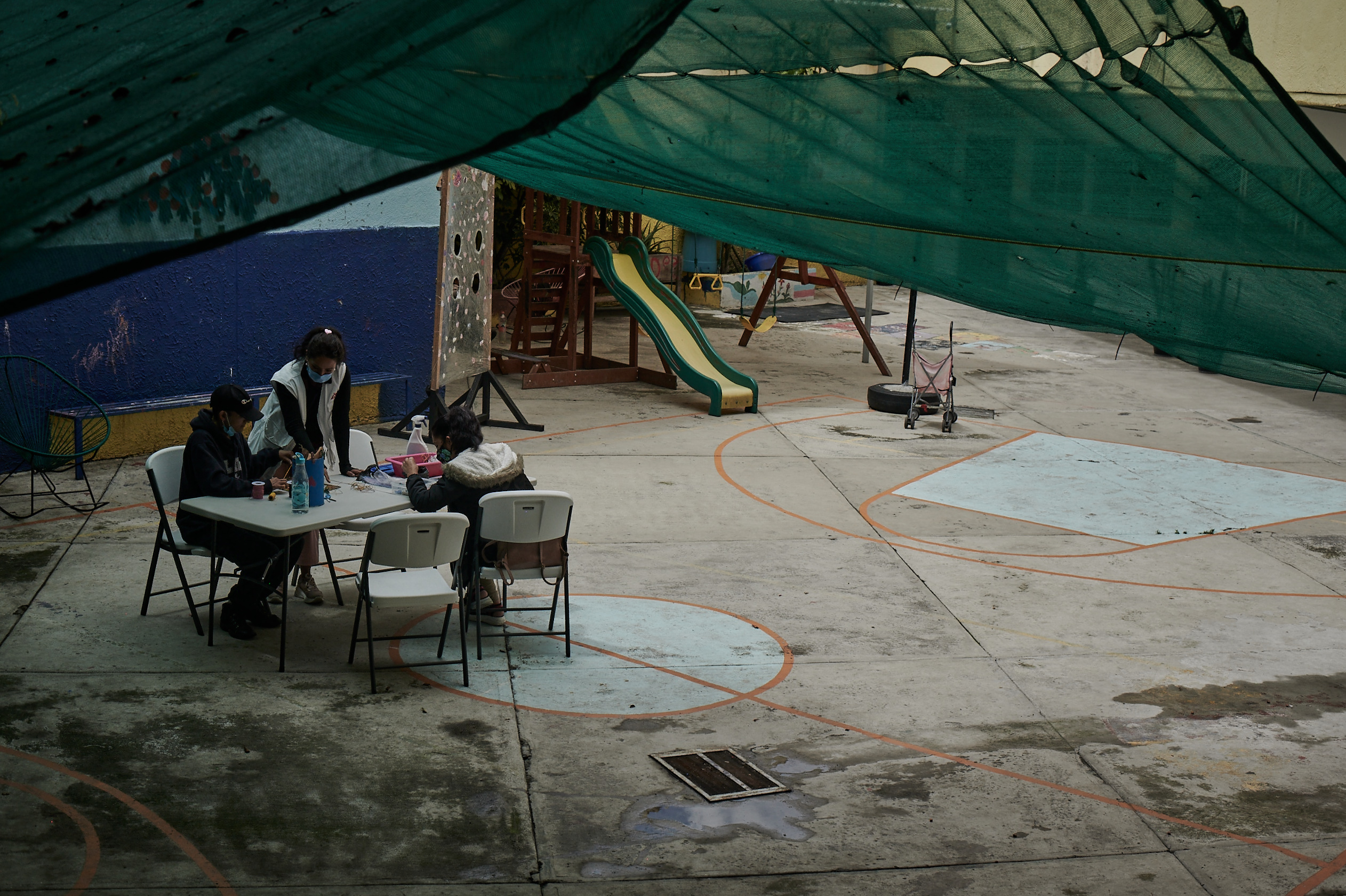 Environ quinze personnes, médecins, thérapeutes et assistants sociaux travaillent au sein du CAI. Situé à Mexico dans les locaux d’une ancienne école, c’est un lieu discret, dissimulé derrière un grand mur blanc, dont l’entrée est surveillée en permanence par un gardien. Créé en 2017 sous forme de refuge, il fonctionne depuis 2019 comme un centre d’accueil de jour où tous les services collaborent étroitement pour apporter une prise en charge globale.