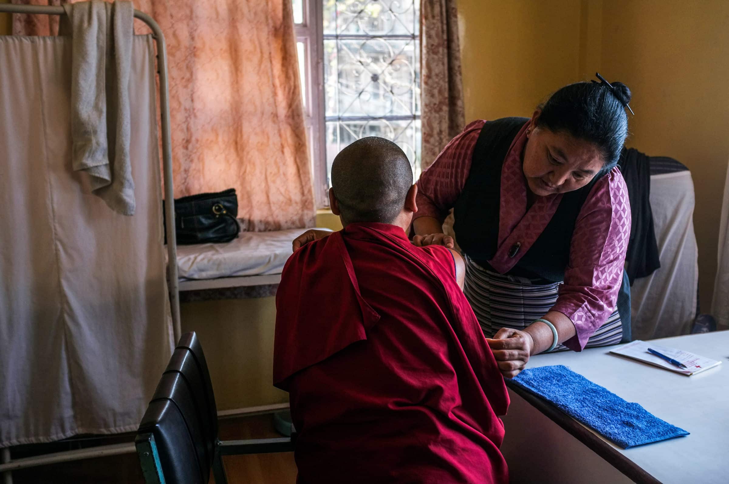 - Dharamsala, Inde, 2012 – Docteur Dachoe osculte une none dans son cabinet.