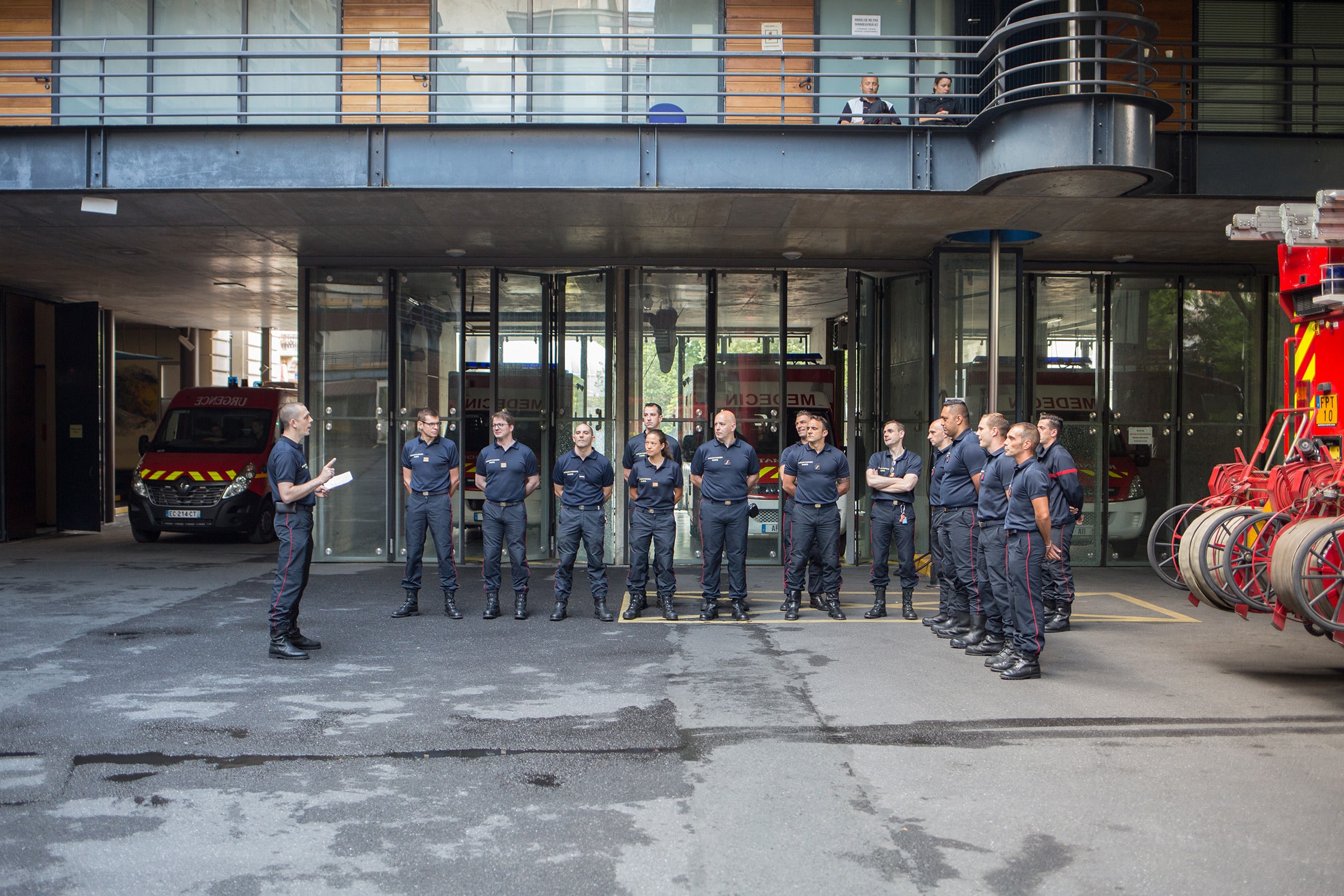 Tous les matins à 7 h 45, les sapeurs-pompiers de garde du Centre médical de Ménilmontant se rassemblent dans la cour de la caserne et répondent à l’appel de l’adjudant-chef avant d’entendre les consignes de la journée. A effectif complet, ils sont 29 médecins dont des réservistes, 20 infirmiers et 11 conducteurs. © Pascal VO