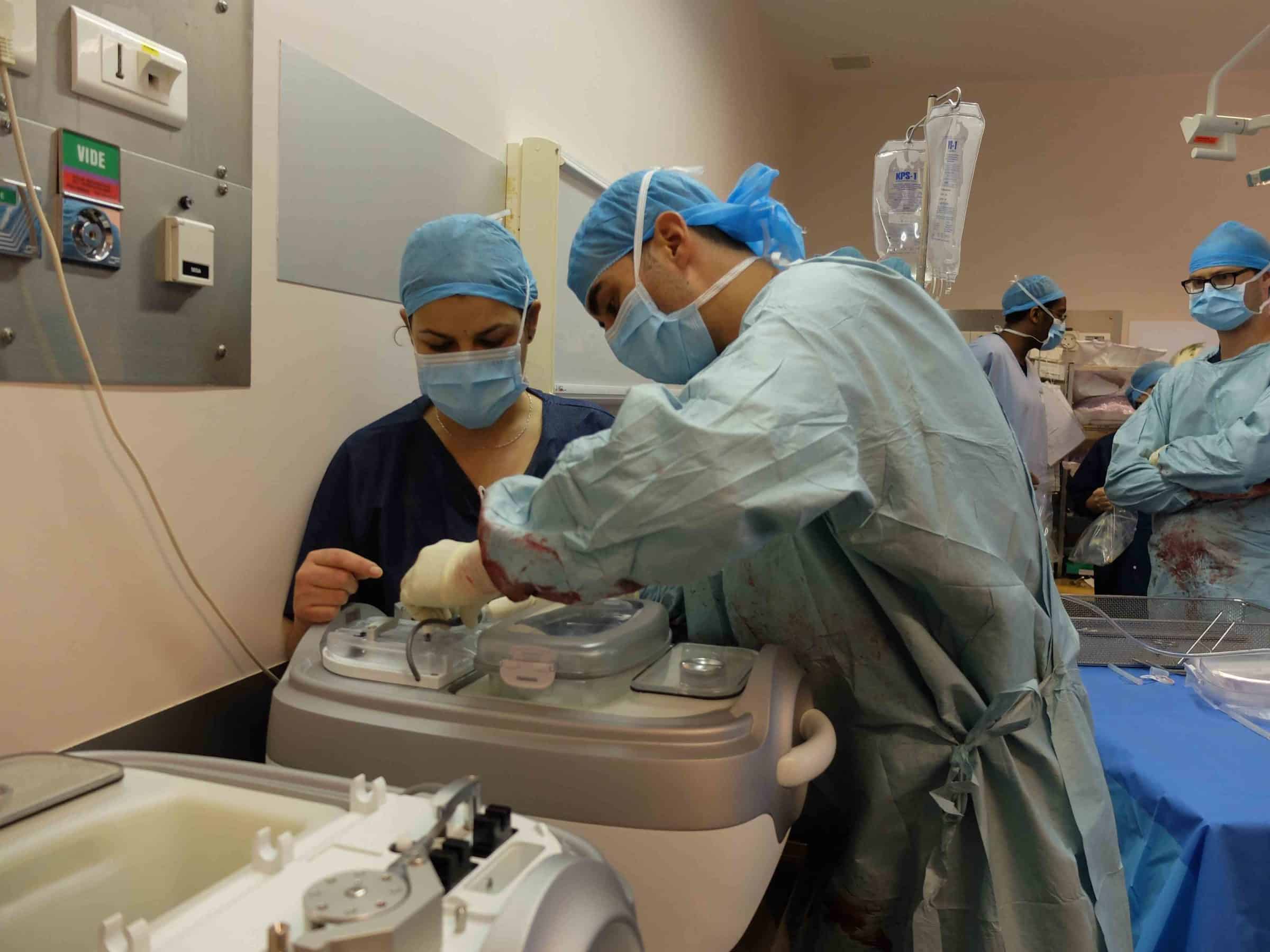 © Delphine Bauer. Dans le bloc opératoire, le chirurgien urologue et Joanne font le point sur le fonctionnement des “vital packs” qui transporteront les organes.