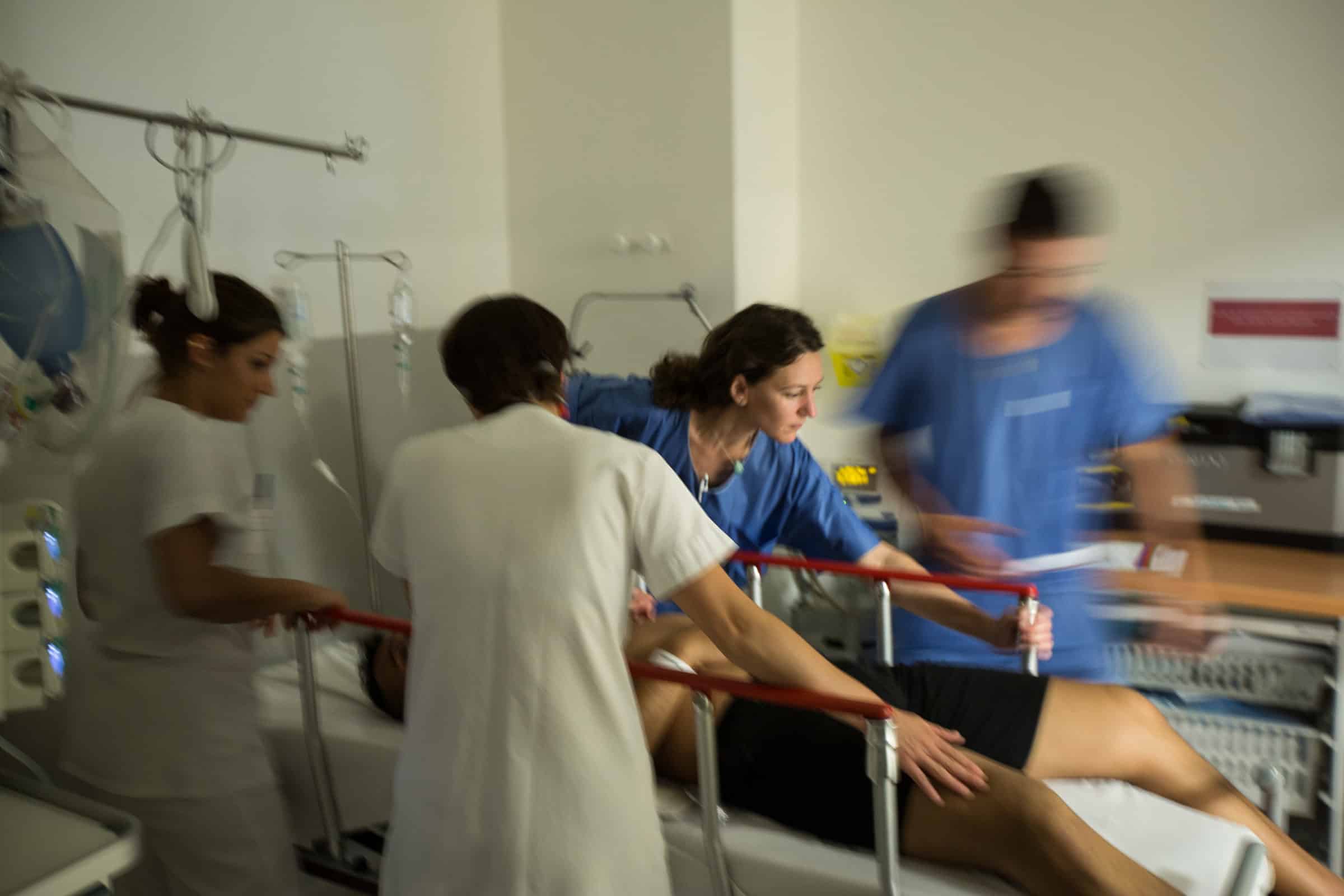 - Et puis, arrive le rush. En dix minutes, tout s’affole. Un malaise vient de survenir àproximité des urgences, une autre personne arrive en détresse respiratoire, un troisièmepatient est admis après une chute et un quatrième pour un accident vasculaire cérébral.Tout doit être géré en même temps.