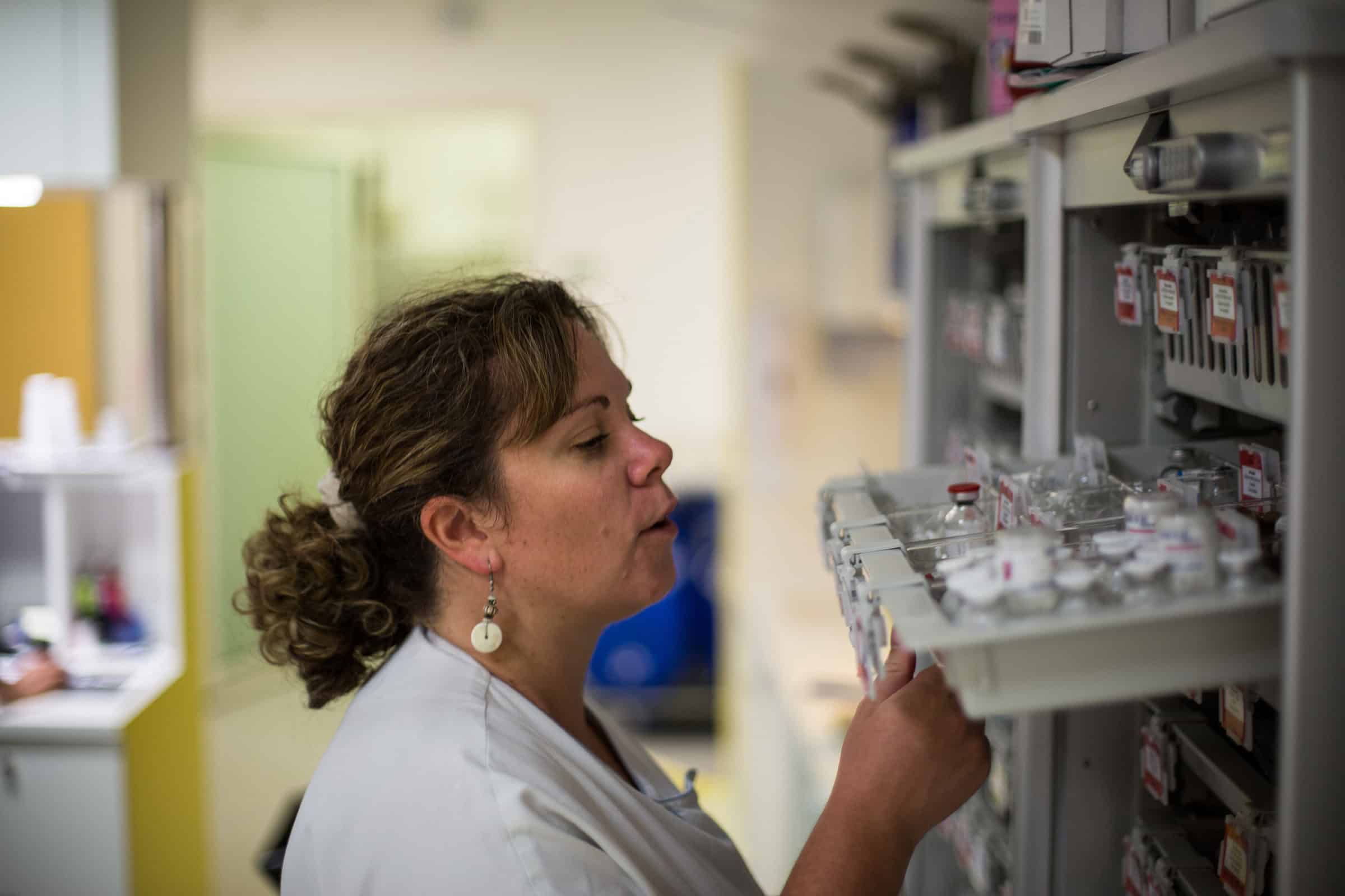- La pharmacie se résume à deux étagères. Ici, pas le droit à l’erreur. « Un jour, avoue Magalie,j’ai administré une solution pour résorber des caillots dans les reins à une personne quiavait une toux conséquente. Résultat, elle est allée aux toilettes dix fois dans la journée ettoussait toujours autant. » Les médicaments considérés comme drogue ou provoquant desaccoutumances lourdes sont stockés dans un tiroir à code que seule l’infirmière en chef peutouvrir. « On n’a jamais eu de cas de vol avec l’ancien coffre même si les clefs n’étaient pasforcément bien cachées », ajoute-t-elle.