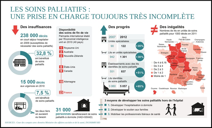 - sur 238 000 décès en court séjour hospitaliers (susceptibles de nécessiter des soins palliatifs), seuls 32,8 % des patients ont bénéficié de cette prise en charge