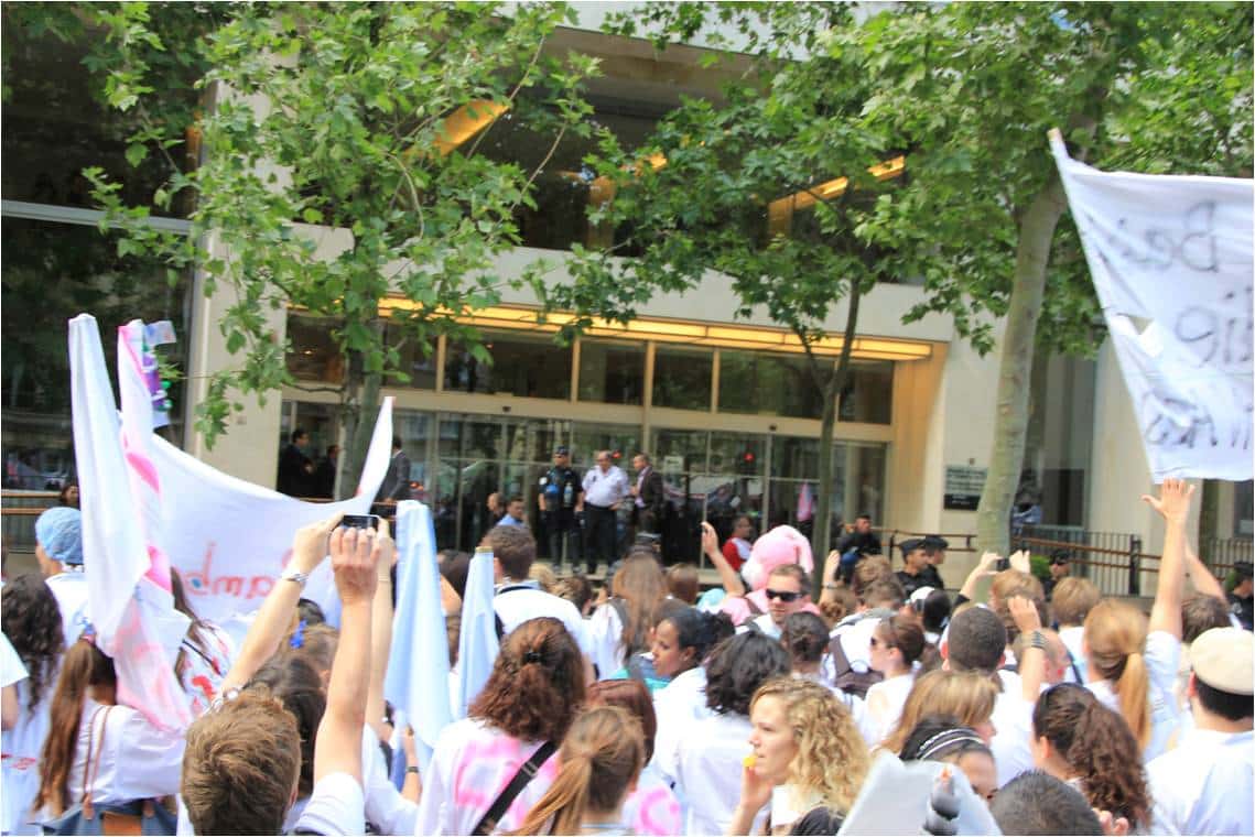 14h45 : Les étudiants infirmiers sont à présent devant le ministère dans une ambiance survoltée. Une délégation doit être reçue dans des toutes prochaines minutes.