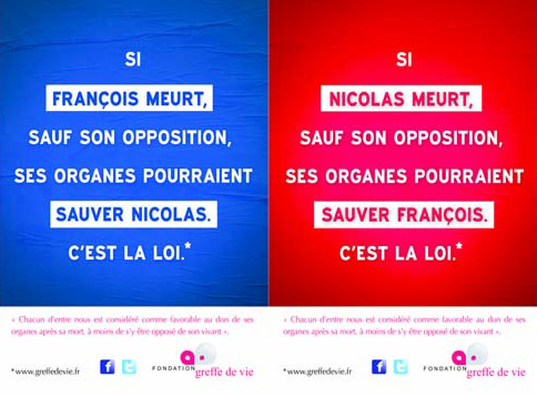 “Si François meurt, sauf son opposition, ses organes pourraient sauver Nicolas. C’est la loi !” et “si Nicolas meurt”, c’est pareil. C’est sur ce ton que la Fondation greffe de vie veut faire connaître la loi méconnue sur le don d’organes, vidéo à l’appui.