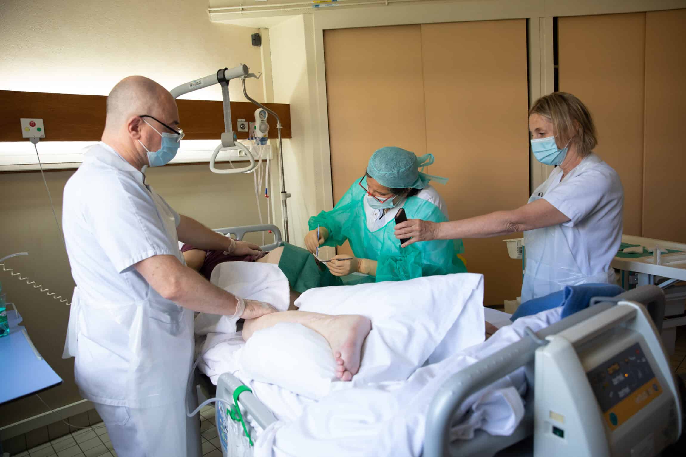 Au sein de tous les services, l’ensemble des professionnels travaillent en collaboration. Si les infirmières constatent qu’un patient est dénutri, elles peuvent faire appel au diététicien, « qui peut aussi décider d’enrichir son alimentation pour favoriser la cicatrisation d’une escarre », précise le Dr Bouix.