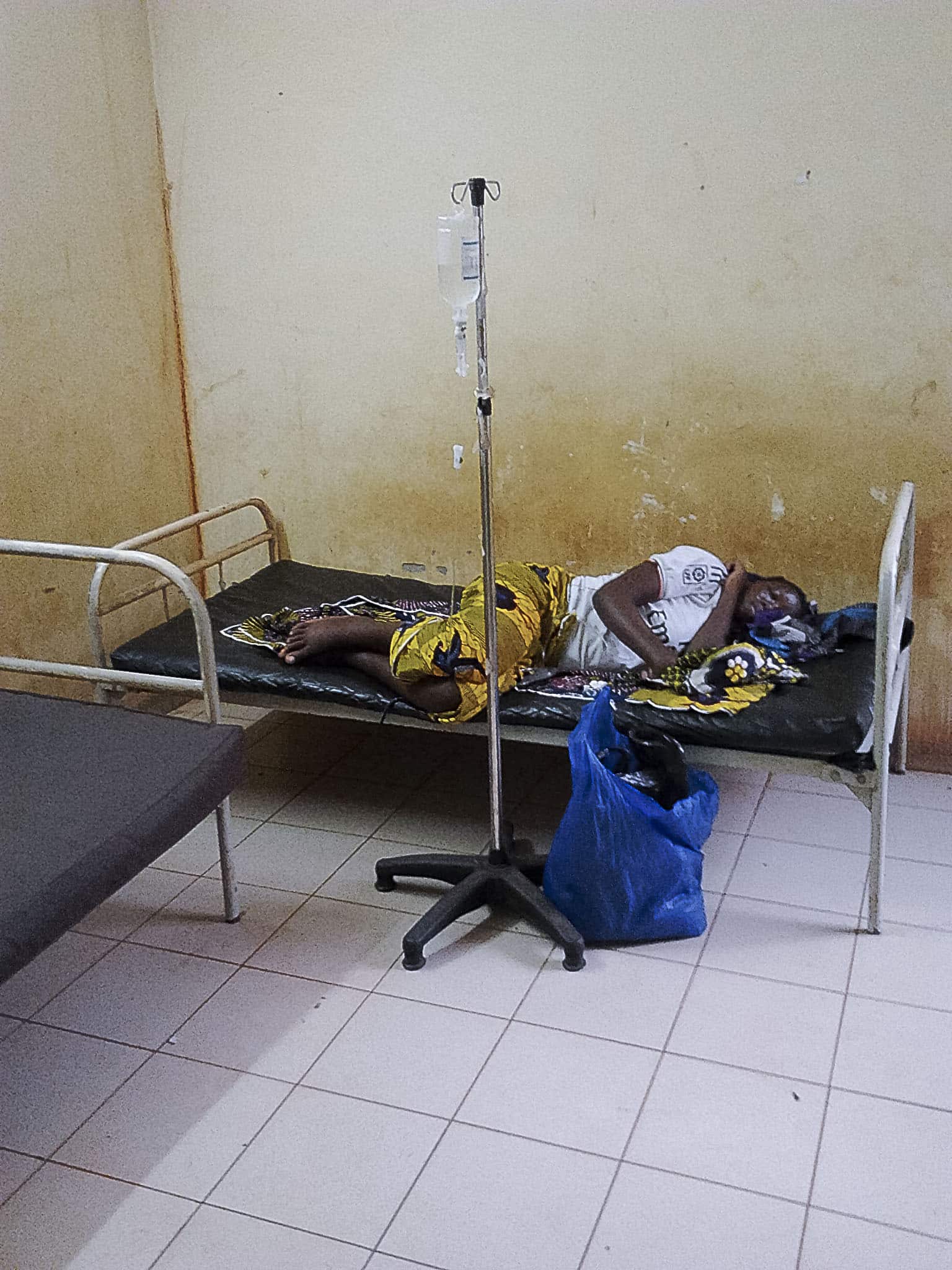 L’infirmier fait une ordonnance avec tout ce qui est nécessaire pour perfuser la quinine et faire chuter la température. Il la donne à la maman en lui disant « tu vas payer ça et tu reviens ». Les minutes passent, la petite fille attend sur le lit de consultation ; l’infirmier en profite pour faire entrer le patient suivant.