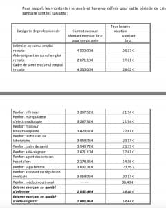En avril 2020, une première note de service interne de la direction des ressources humaines de l’AP-HP, mise en application dans les services Covid**, a prévu une rémunération horaire de 21,54 euros brut pour les infirmiers en renfort CDD ou en vacation et 17,61 euros pour les aides-soignants. Soit plus de 3260 euros brut par mois pour un infirmier à temps plein et 2670 euros pour un aide-soignant.