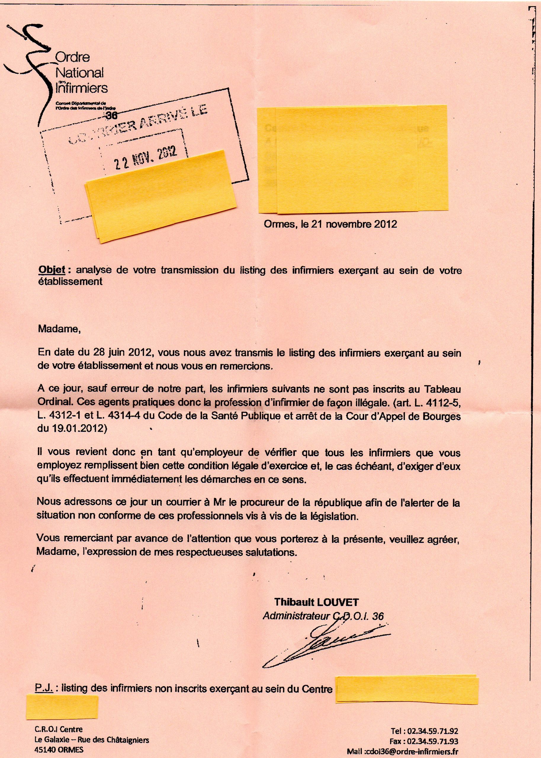 Suite à l’inquiétude affichée par certains établissements ayant reçu des “injonctions” de l’Ordre concernant des infirmiers non-inscrits, inquiétude relauyée par la FHF, nous reproduisons une de ces lettres envoyées par le Conseil départemental de l’Ordre à un établissement du Loiret, en 2012 :