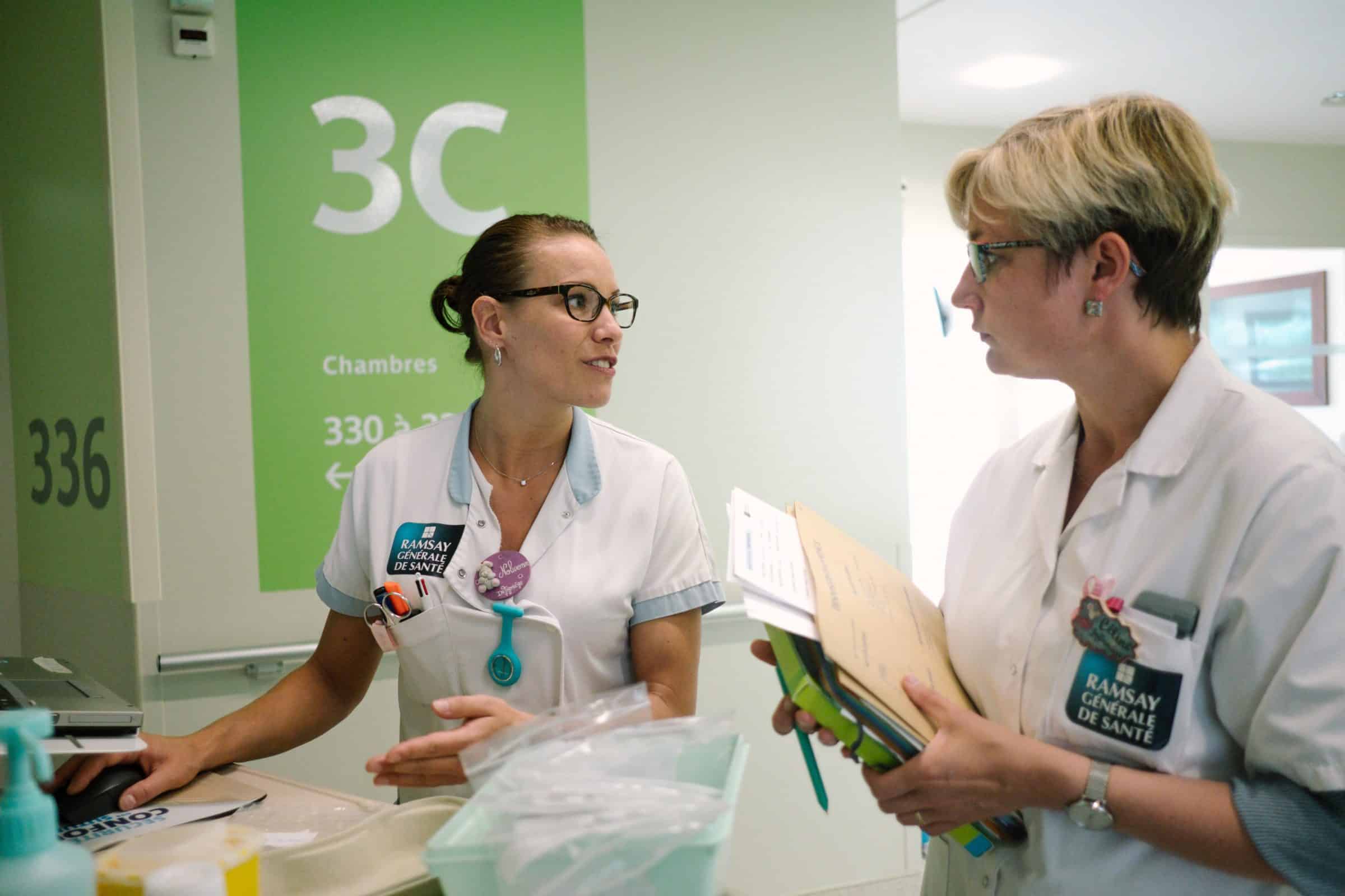 Nolwenn Mulot, infirmière en chirurgie gynécologique (à, gauche), fait les transmissions concernant les patientes que Céline Hauchecorne, infirmière coordinatrice (à droite), s’apprête à rencontrer. © Hervé Chatel / Hans Lucas