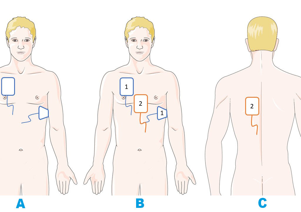 Le placement des patchs se fait pendant les compressions thoraciques. Le premier patch se pose sous la clavicule droite et le second au niveau de la ligne axillaire gauche, sous le pectoral. En cas d’oubli, des pictogrammes sont affichés sur les électrodes. Lors de l’utilisation d’un défibrillateur automatique, il est nécessaire de positionner les patchs avant de les brancher. En effet, le défibrillateur commence l’analyse dès qu’il détecte le branchement des électrodes, même si celles-ci ne sont pas encore placées sur le corps de la personne.
