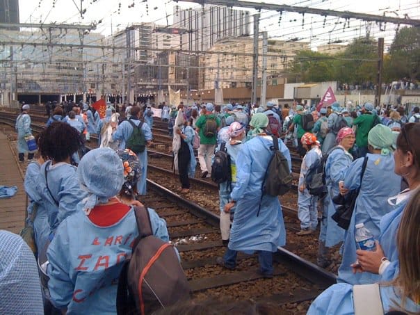 Depuis 2 mois, la colère montait crescendo et les actions coup de poing se multipliaient dans toute la France. Le mouvement des infirmiers anesthésistes a connu son apogée mardi, après quatre mobilisations nationales. Vers 12h30, alors que le cortège, parti de la Place Denfert Rochereau s’approche du Ministère de la Santé, une voix retenti du camion sono: le ministère refuse de recevoir une délégation d’infirmiers anesthésistes. Motif invoqué: le salon Hôpital Expo a été perturbé par quelques manifestants de l’AP-HP. Une clameur monte, avant que le mot d’ordre ne tombe: “Courez tous le plus vite possible gare Montparnasse!” Les rues se vident et les manifestants envahissent en quelques minutes la gare, devant des passagers et cheminots médusés.