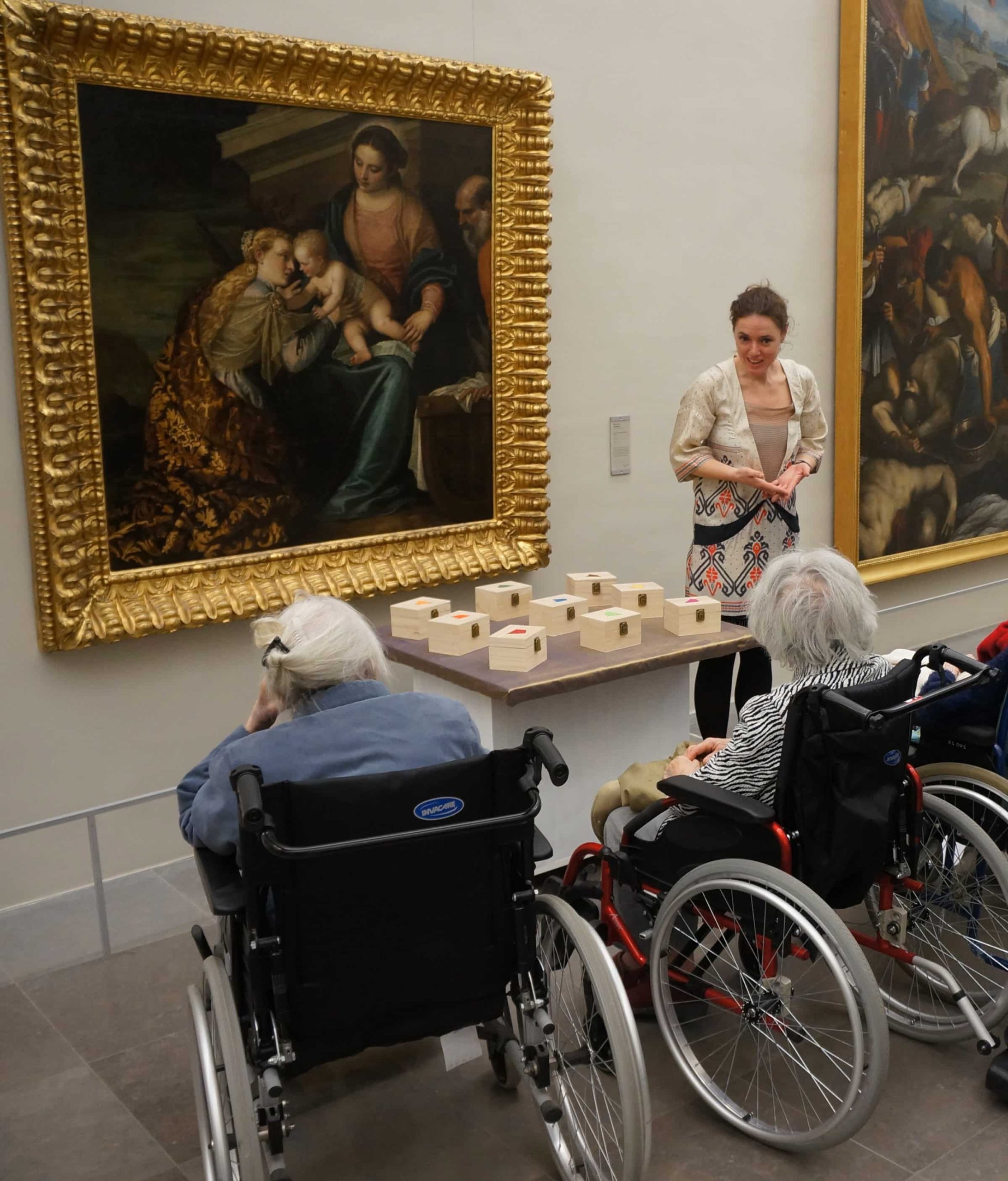 A cette partie cognitive succède la découverte sensorielle du tableau, avec ses détails transformés par un plasticien du musée en matière ou objet à toucher, sentir, voir, entendre. Le but ? Recréer la toile pour que des patients avec de gros troubles cognitifs puissent y accéder grâce à une stimulation globale de ses capacités restantes.“ Le mariage mystique de Sainte-Catherine ”,chef d’œuvre de Véronèse (XVIe s.), par exemple, décliné en plumes, étoffe, broche, fil d’or, myrrhe, boite à musique, bouquet de fleur, ou “ Vertumne et Pomone ”, de Jean Ranc (XVIIIe s.), donnant à sentir ou goûter les pommes et les poires d’une corbeille de fruits, manipuler une ombrelle, toucher une robe satinée…