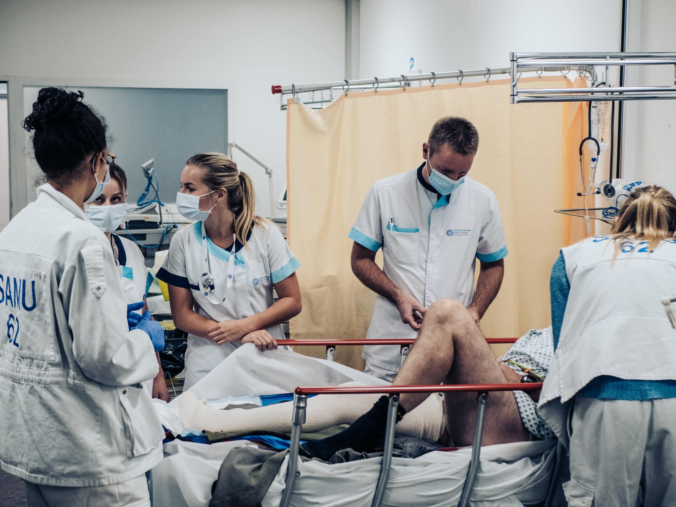 Peu après, un second patient est amené par le Samu du Pas-de-Calais. Séparé du premier patient par un rideau, il gémit de douleur : il a la jambe cassée. L’équipe du Smur l’a déjà « techniqué ». Mathilde s’affaire avant l’anesthésie. « Mettez double dose, demande-t-il. Je suis d’une nature anxieuse. » L’infirmière le rassure : « tout va bien se passer, monsieur ».