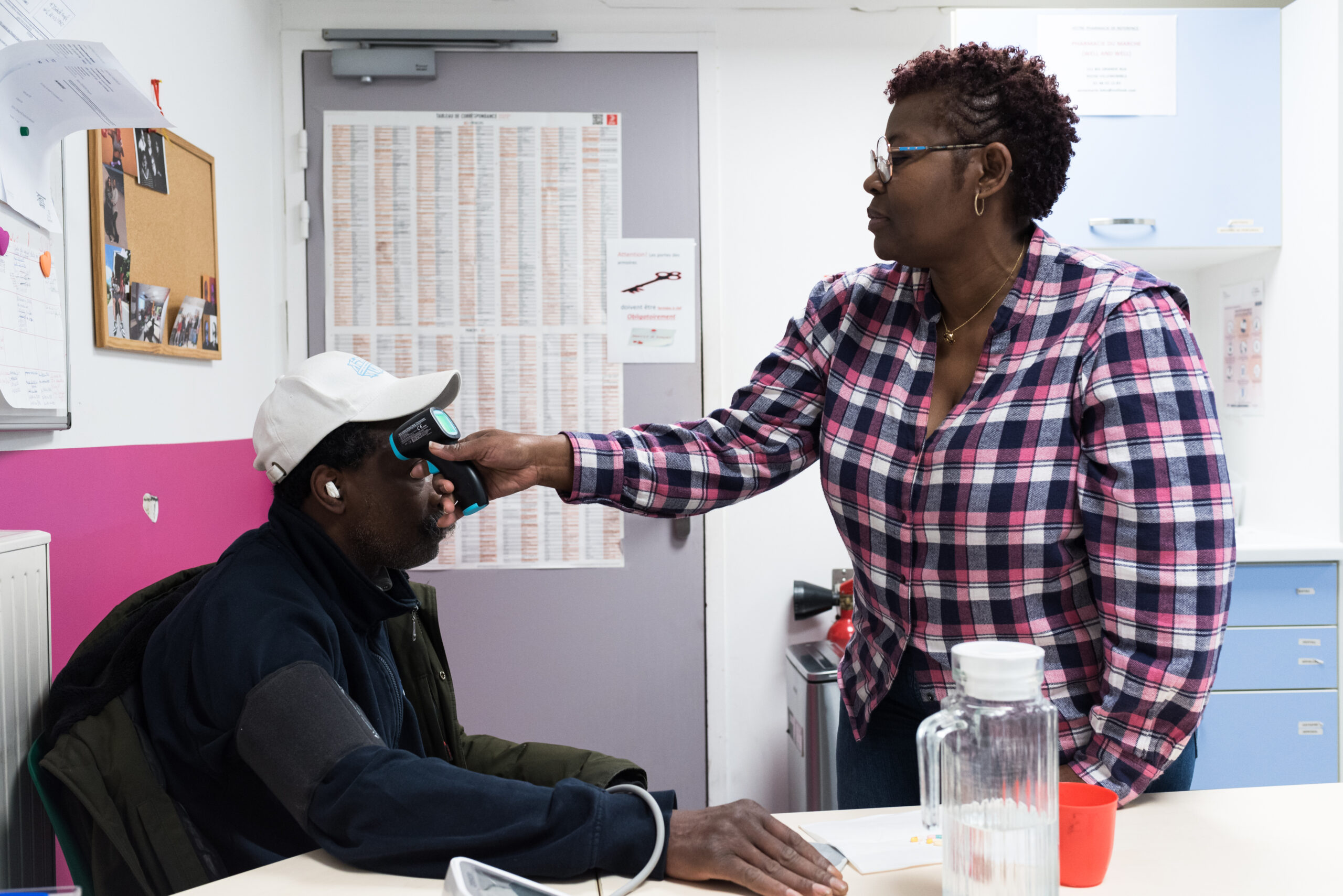 Parmi elles, Thusharaha Chithirakumar, 28 ans, et Léocadie Duchant, 55 ans. Dans leur cabinet, elles reçoivent toute la journée les résidents qui se sentent mal, mais assurent aussi leur prise de médicaments, les entretiens (accueil, stabilisation, éducation thérapeutique…), les accompagnements chez le médecin ou même des activités extérieures, bowling ou cinéma. Un résident passe justement la porte. Il a mal aux dents et aux oreilles et se sent fébrile. « On va vous prendre la température », annonce Thusharaha. S’en suit une prise de tension et une distribution de Doliprane. « Il faut aller voir un dentiste, l’infection peut remonter », met-elle en garde. Il leur arrive régulièrement d’appeler le Samu ou les pompiers, dans des cas d’épilepsie, d’hypotension ou encore de désaturation.