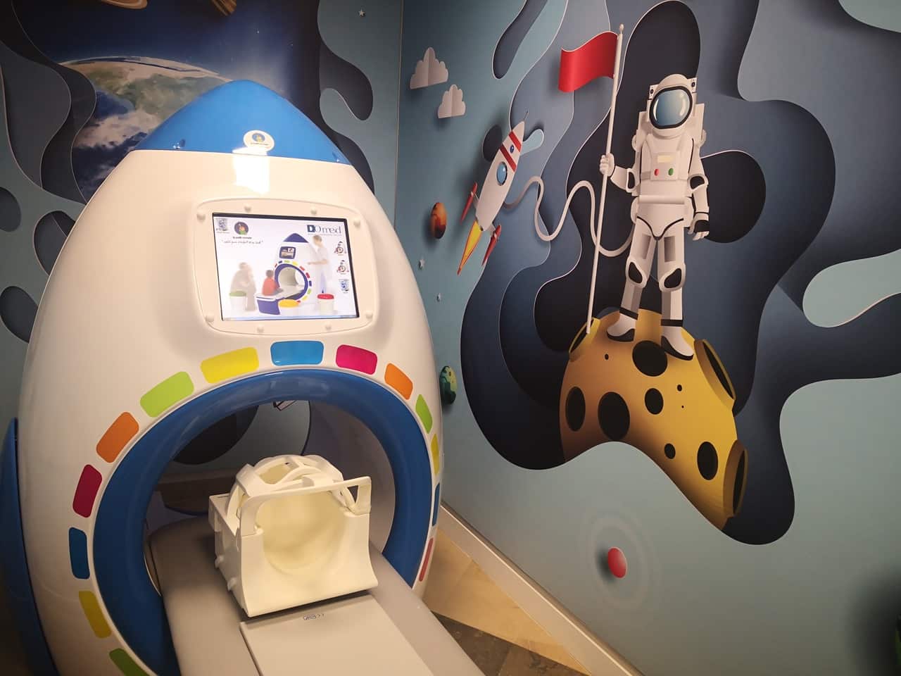 L’IRM en jeu, inauguré en mars dernier dans la salle d’attente du service ressemble à une petite fusée de 1,40 m de haut, percée au centre par un mini tunnel avec une petite table pour s’allonger. Le tout dans une pièce au décor évoquant la conquête spatiale.