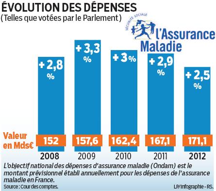 Les dépenses d’assurance maladie sont estimées à 174,1 milliards d’euros pour l’année 2013, soit finalement une progression de 2,4 % contre 2,7 % prévus au budget de la Sécurité sociale, a souligné le 11 avril le comité d’alerte sur les dépenses d’assurance maladie.