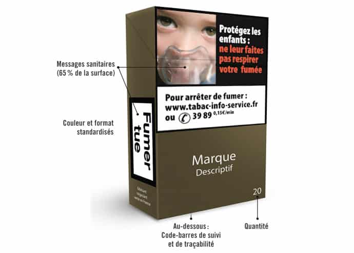 Le paquet neutre se caractérise par des critères spécifiques. Une seule et même couleur pour tous les paquets de cigarette et de tabac à rouler, quelle que soit leur marque, les mêmes modalités d’inscription de la marque sur les emballages ainsi que des avertissements sanitaires plus choc, combinés (texte et visuel) et élargis à 65% du paquet (contre 30% à 40% aujourd’hui).