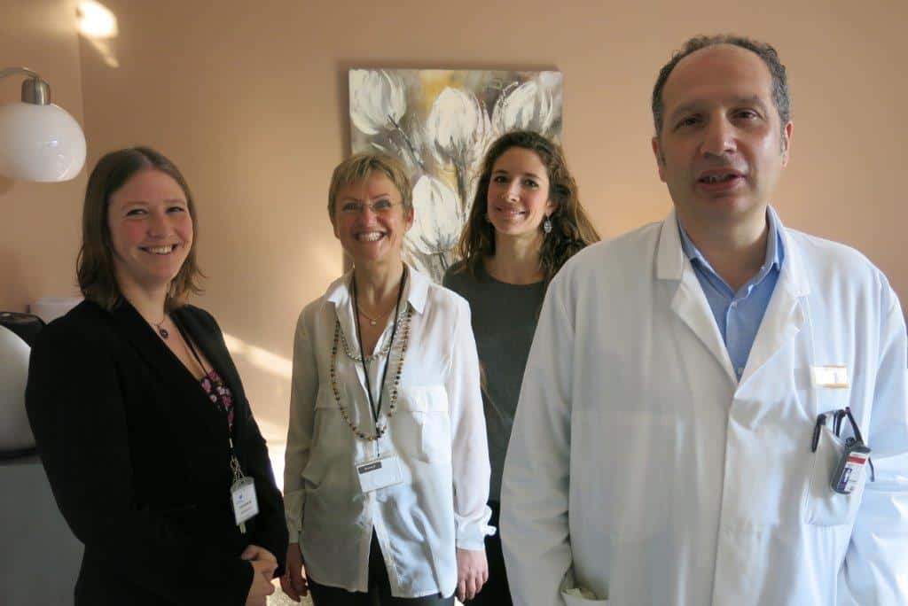De gauche à droite : Camille Obry, référente administrative du projet, Catherine Bouquet, directrice des soins, Emilie Vaquette, infirmière de coordination, et le Docteur Michel Gozy, coordinateur médical du projet et cancérologue. ©M. Totet