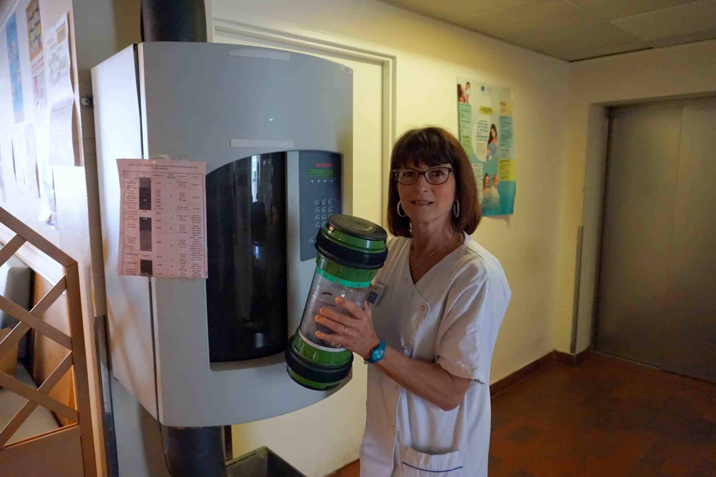 Corinne Delfolie, infirmière, devant la station pneumatique de son service. © Laure Martin.