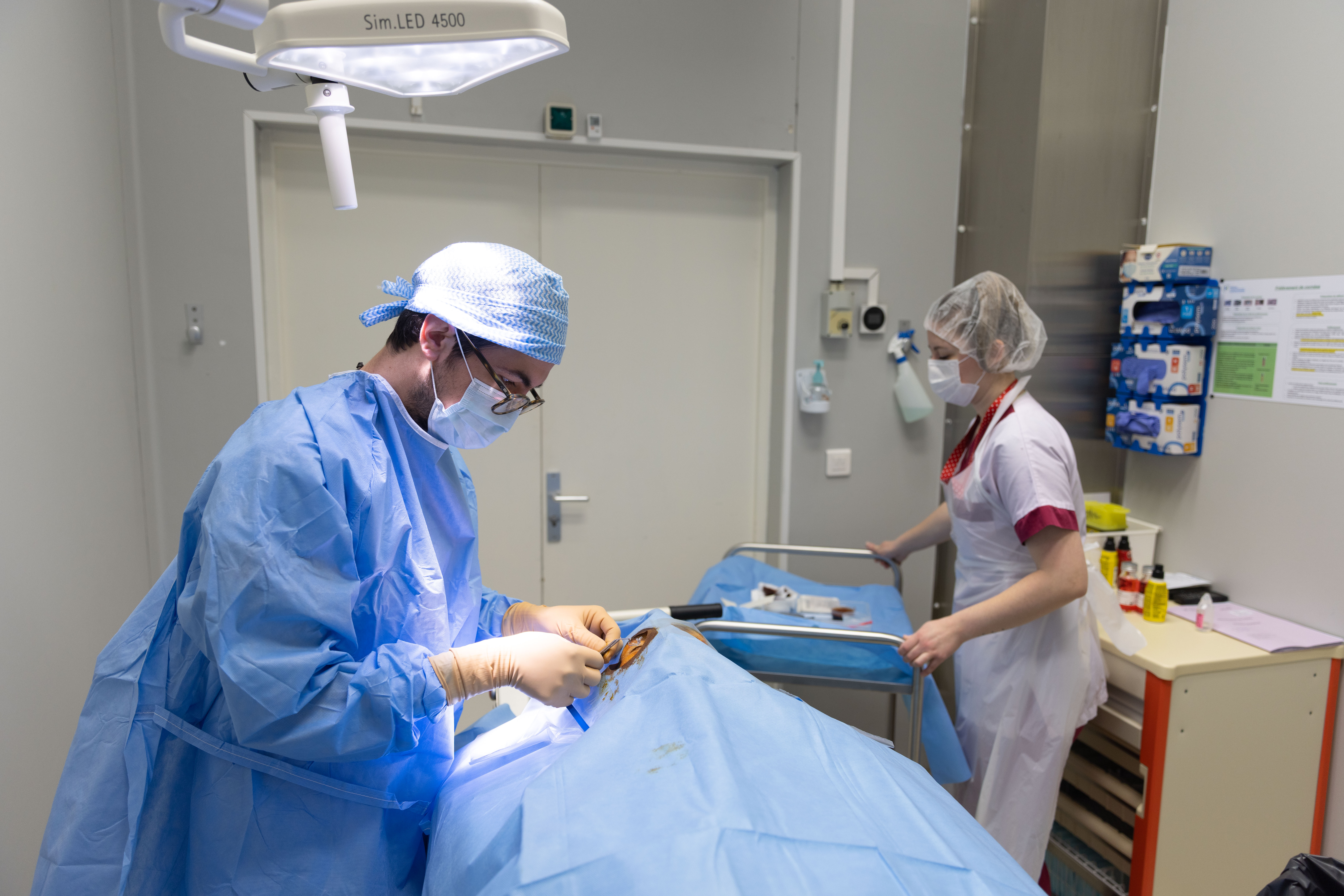 « Je vais chercher le corps de la défunte dans la cellule mortuaire », prévient-elle. Une fois installée, elle commence la pré-désinfection. Quatre étapes sont à respecter : le nettoyage de la zone péri-oculaire avec un antiseptique moussant ; le rinçage au sérum physiologique ; le séchage à l’aide de compresses ; puis l’humification de la zone péri-oculaire avec un antiseptique dermique et instillation dans l’orbite et les culs de sac conjonctivaux. « Je dépose ensuite des compresses sur les yeux de la défunte en attendant le médecin », explique-t-elle. Le médecin préleveur arrive justement et commence par vérifier la conformité du dossier car il engage sa responsabilité. Il s’habille ensuite en stérile, avant d’installer son champ opératoire après que l’infirmière a retiré les compresses. Après avoir mis en place un blépharostat pour maintenir l’œil ouvert, il désinfecte la zone d’intervention en stérile. Commence alors le prélèvement, procédure au cours de laquelle Amélie Maillard l’assiste en tant qu’aide-opératoire.