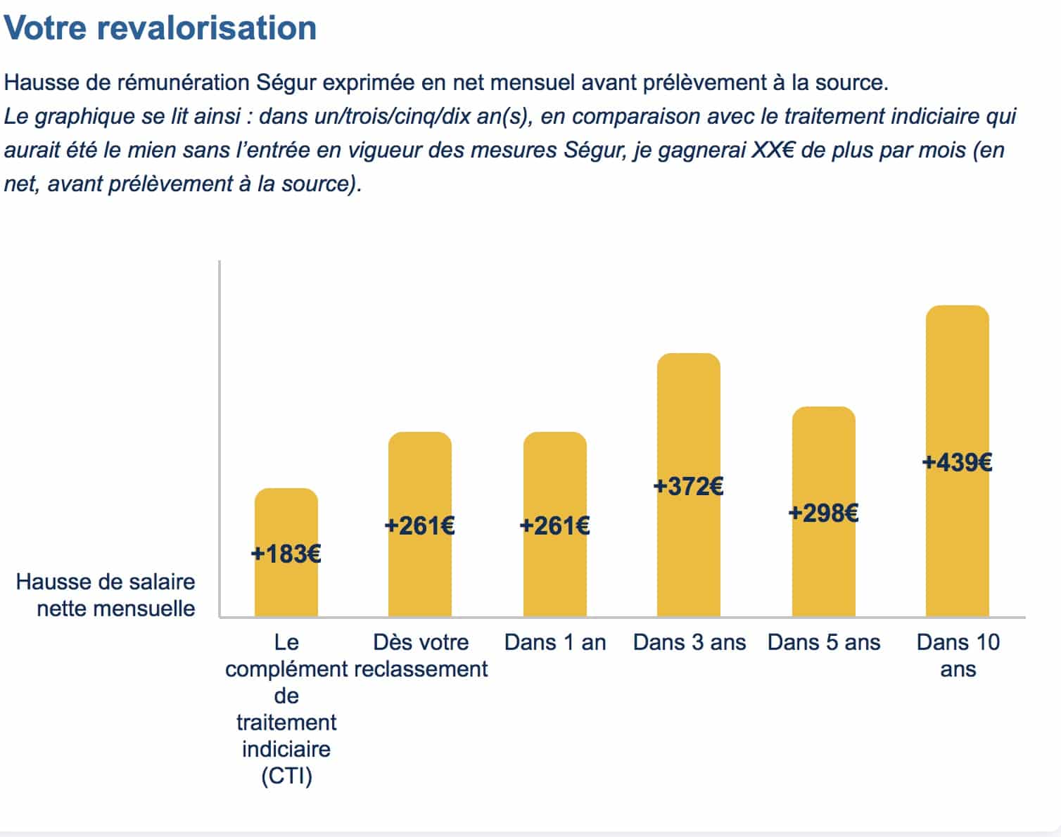 Même professionnel. Cette fois, le graphique représente la hausse de rémunération Ségur en comparaison avec le traitement qui aurait été calculé sans l’entrée en vigueur des mesures Ségur (sans CTI ni évolution des grilles donc).