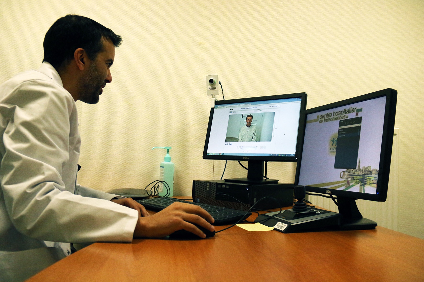 Le Dr Nabil Elbeki, chef du pôle Urgences, réanimation et anesthésie, Médecine polyvalente et Unité sanitaire en milieu pénitentiaire au centre hospitalier de Valenciennes, en consultation de télémédecine. © DR