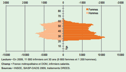 Les infirmières sont en moyenne plus jeunes que les aides-soignantes : les moins de 35 ans « sont plus nombreux que les plus de 50, même si l’on peut observer un creux entre 31 et 37 ans ». L’étude apporte deux explications : « les quotas d’entrée en formation d’infirmier ont quasiment doublé entre 1998 et 2003, passant de 16 000 à 30 000 étudiants » et les infirmières doivent exercer pendant deux ans en tant que salariés dans un établissement avant de passer en exercice libéral.
