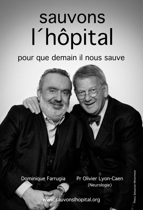 Une autre affiche place côte à côte le professeur de neurologie Olivier Lyon-Caen avec son patient, l’humoriste Dominique Farrugia, atteint de sclérose en plaque.