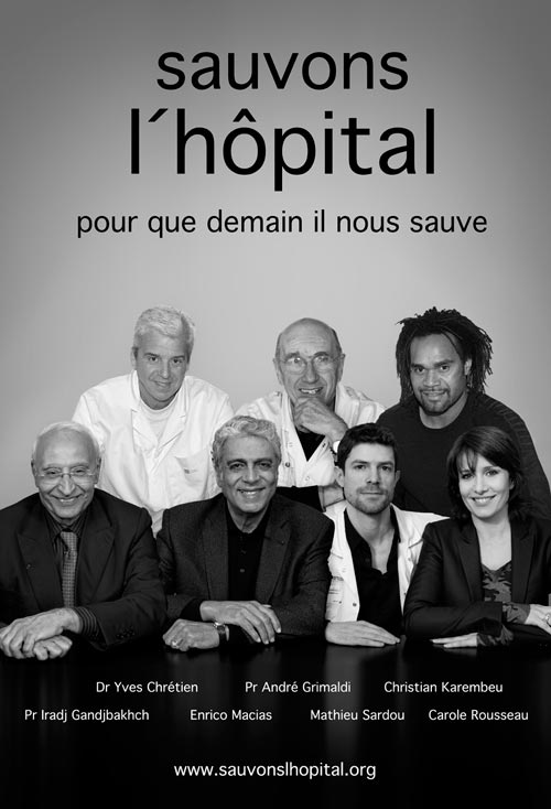 Une des affiches montre, dans une mise en scène suggérée par Karl Lagerfeld, quatre infirmières en blouse blanche sur une échelle, entourées du couturier, du président de l’association et des professeurs Stanislas Pol (hépatologie) et Bernard Granger (psychiatrie).